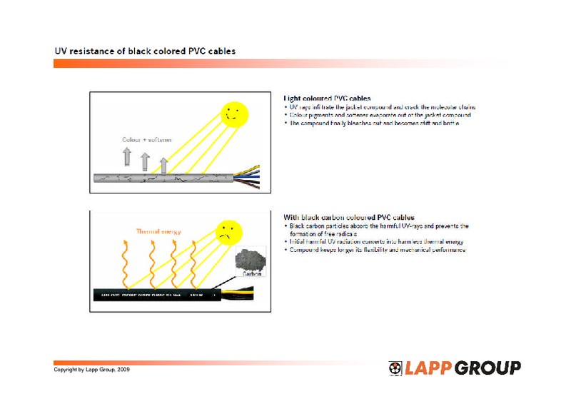 Pavyzdžiui, juodai nedažyti PUR kabeliai lauke gali išblukti ar pabalti, tačiau paprastai išlaiko lankstumą ir mechaninį stabilumą. Silikono kabeliai be juodai dažyto apvalkalo, pavyzdžiui, ÖLFLEX® HEAT 180, taip pat yra atsparūs UV spinduliams. Tačiau tokie kabeliai tinkami tik vidutinio klimato juostoms. Jei jie naudojami vietovėse, kuriose nuolat yra dideli UV spinduliuotės kiekiai (pakrantės zonose, dykumose, vandenynuose, aukštai kalnuose, poliariniuose regionuose ir itin didelio UV spinduliavimo zonose, pavyzdžiui, Pietų Australijoje ar Naujojoje Zelandijoje), tokie kabeliai taip pat turėtų būti juodame apvalkale su anglimi.
